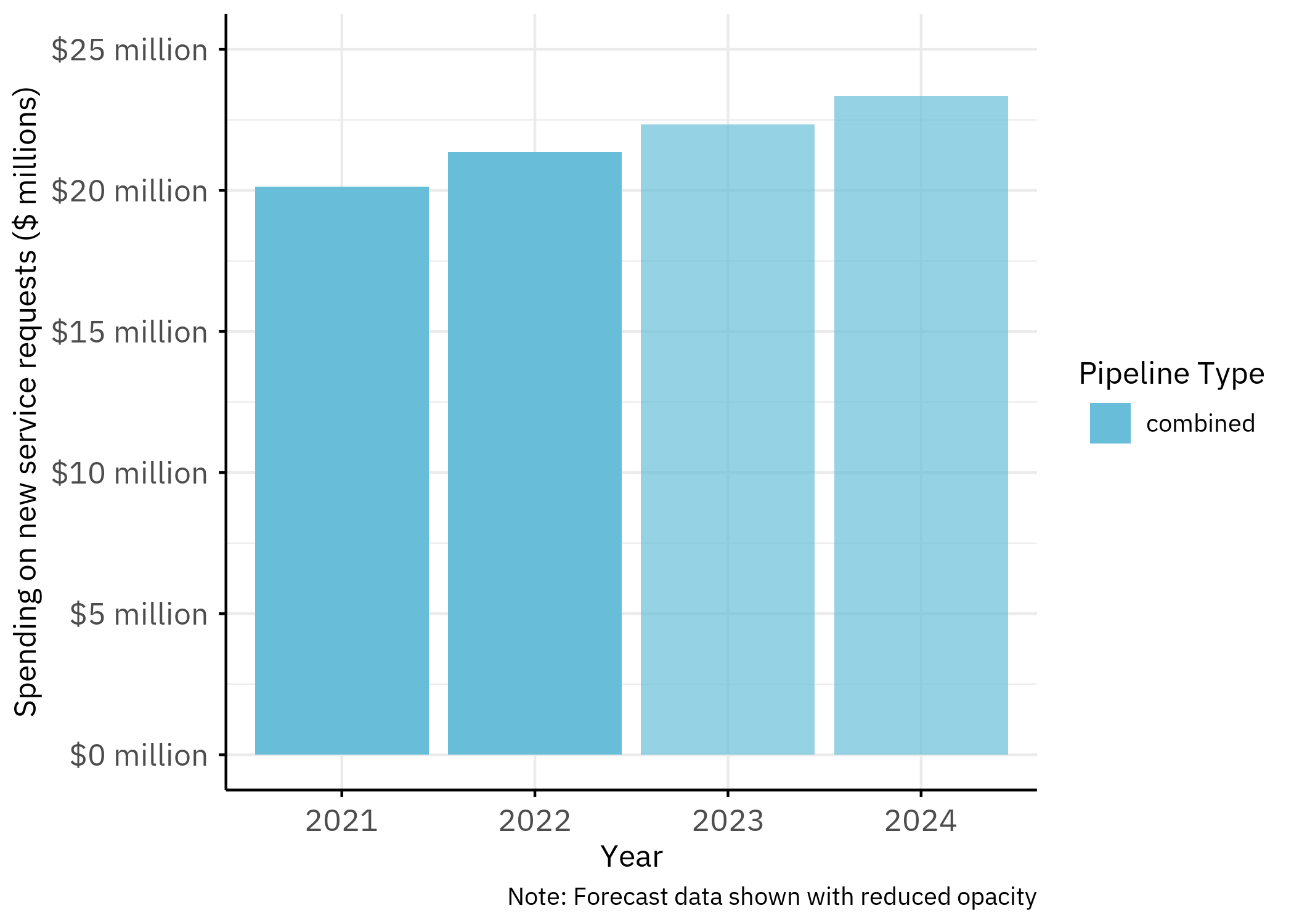 20 Peoples Gas main figures reported as “NonQIP main expenditures” net of customer contributions. Historical (2018–2022): ICC Docket 23-0068, PIO Exhibit 12, p. 36. Forecast (2023–2024): p. 39. Service line historical: p. 36, forecast: p. 40. (Peoples Gas 2023a)