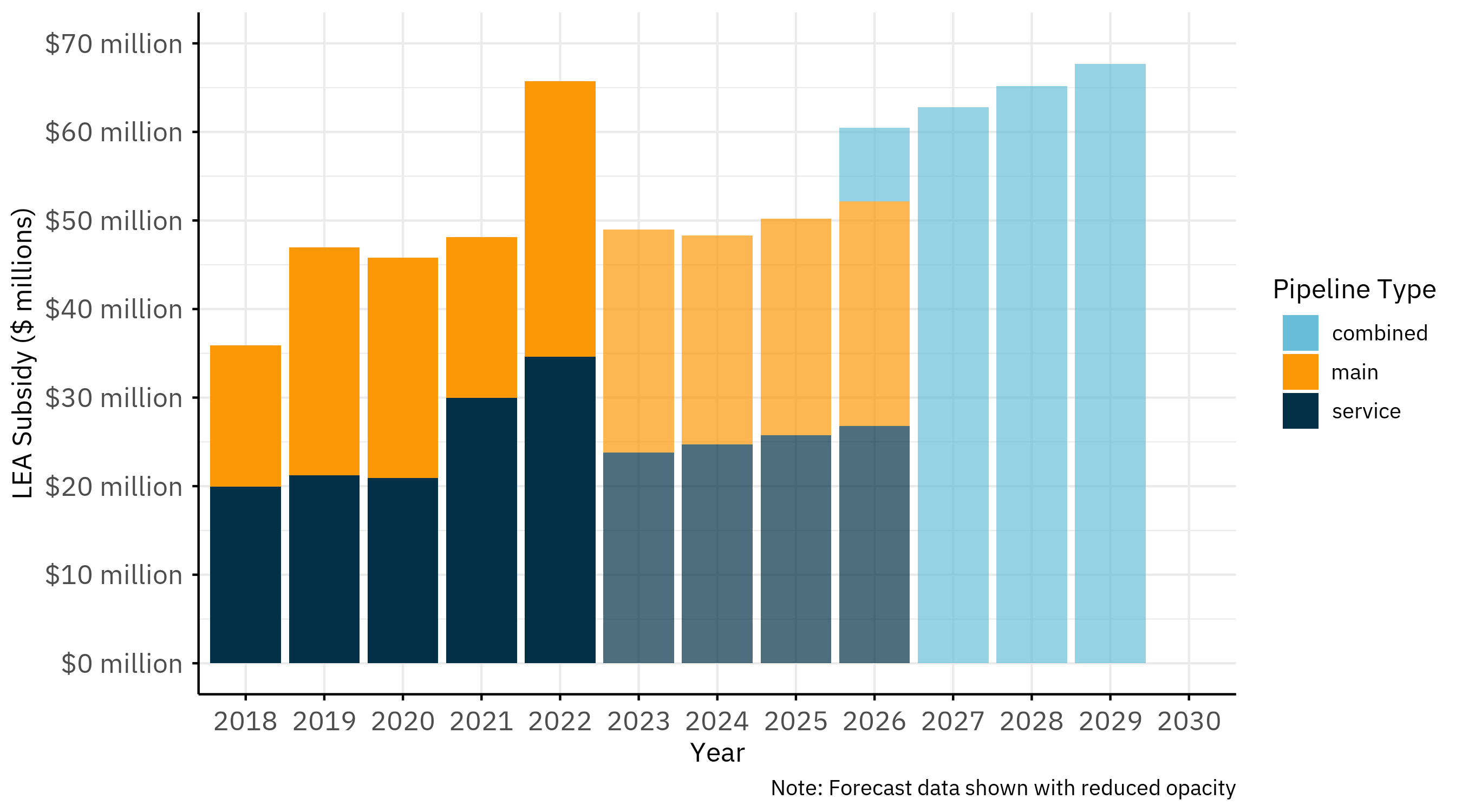 Illinois’s three major gas utilities – Nicor Gas, Peoples Gas, and Ameren Illinois Gas – maintain and/or provide limited information on what they spend on LEA projects. Nevertheless, we collected a mix of historical and forecasted spending data from ICC rate cases — specifically, Docket 23-0066 (Nicor Gas), Docket 23-0068 and 23-0069 (Peoples Gas), and Docket 23-0067 and 25-0084 (Ameren Illinois Gas).12 We combined these with our best estimates for missing data in order to give as full a picture as possible of just how much ratepayers are subsidizing new gas connections.