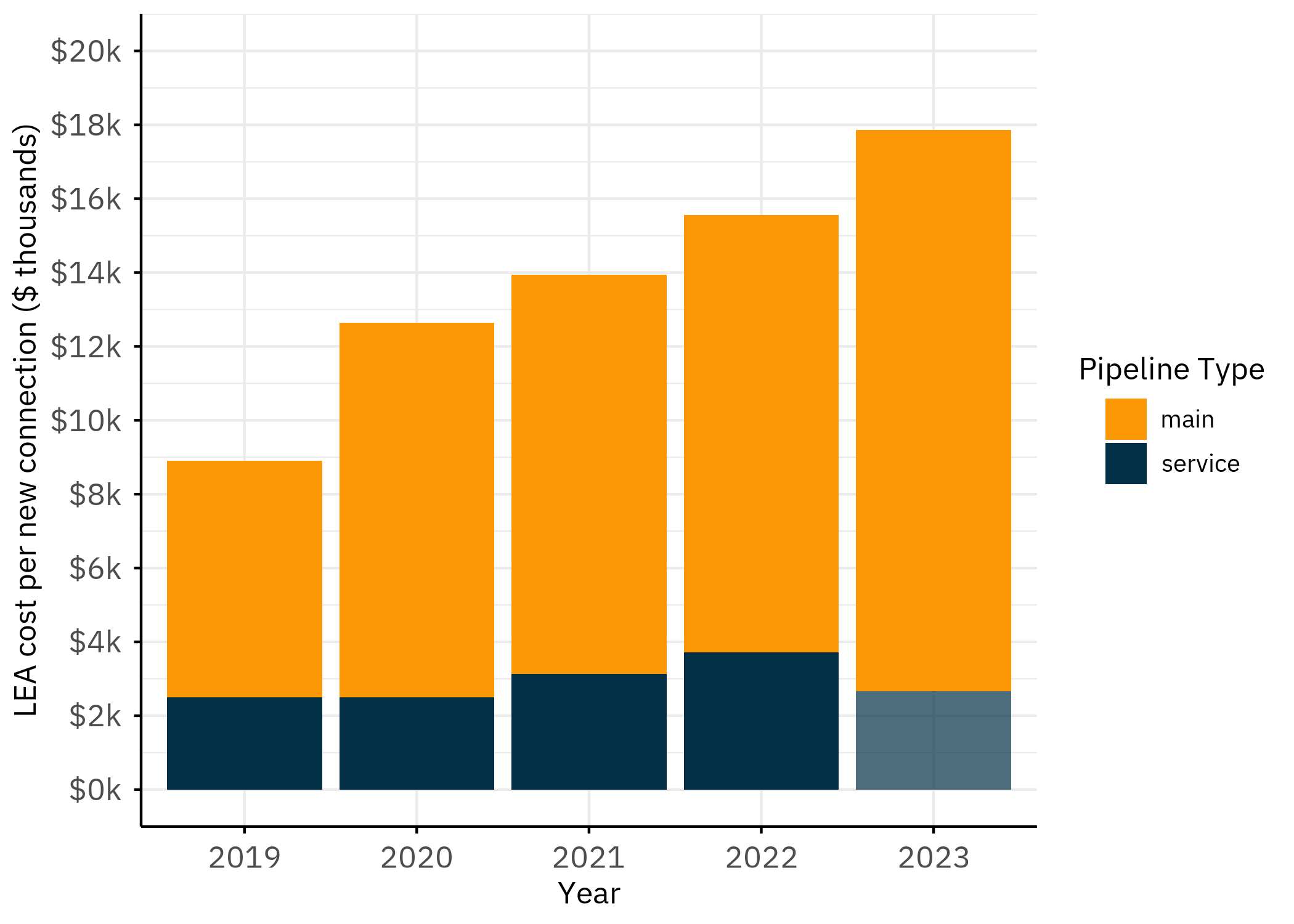These costs are growing. The average cost per connection for a main extension more than doubled from $6,412 in 2019 to the $15,202 it cost in 2023. Main line extensions also got more expensive per foot, rising more than 100%, from $32.06 to $76.01, over the same period.19