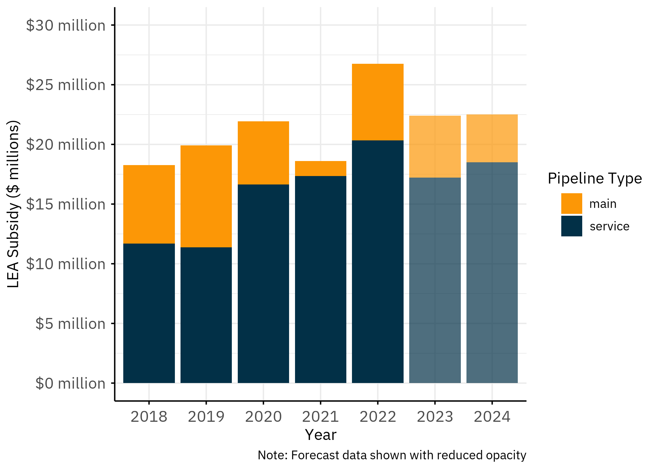 extension_cost+customer_contribution, where CIAC is stored as a negative value. Gross and net figures differ by approximately 3–8 percent in each year.26 - Peoples Gas service line spending, CIAC treatment. Peoples does not explicitly disclose whether its reported service line spending is gross or net of customer contributions. The same filing states that Peoples’ main extension figures are net of customer contributions. We assume the same treatment applies to service lines. If service line figures are instead gross, the actual ratepayer burden would be approximately 3–8 percent lower.27