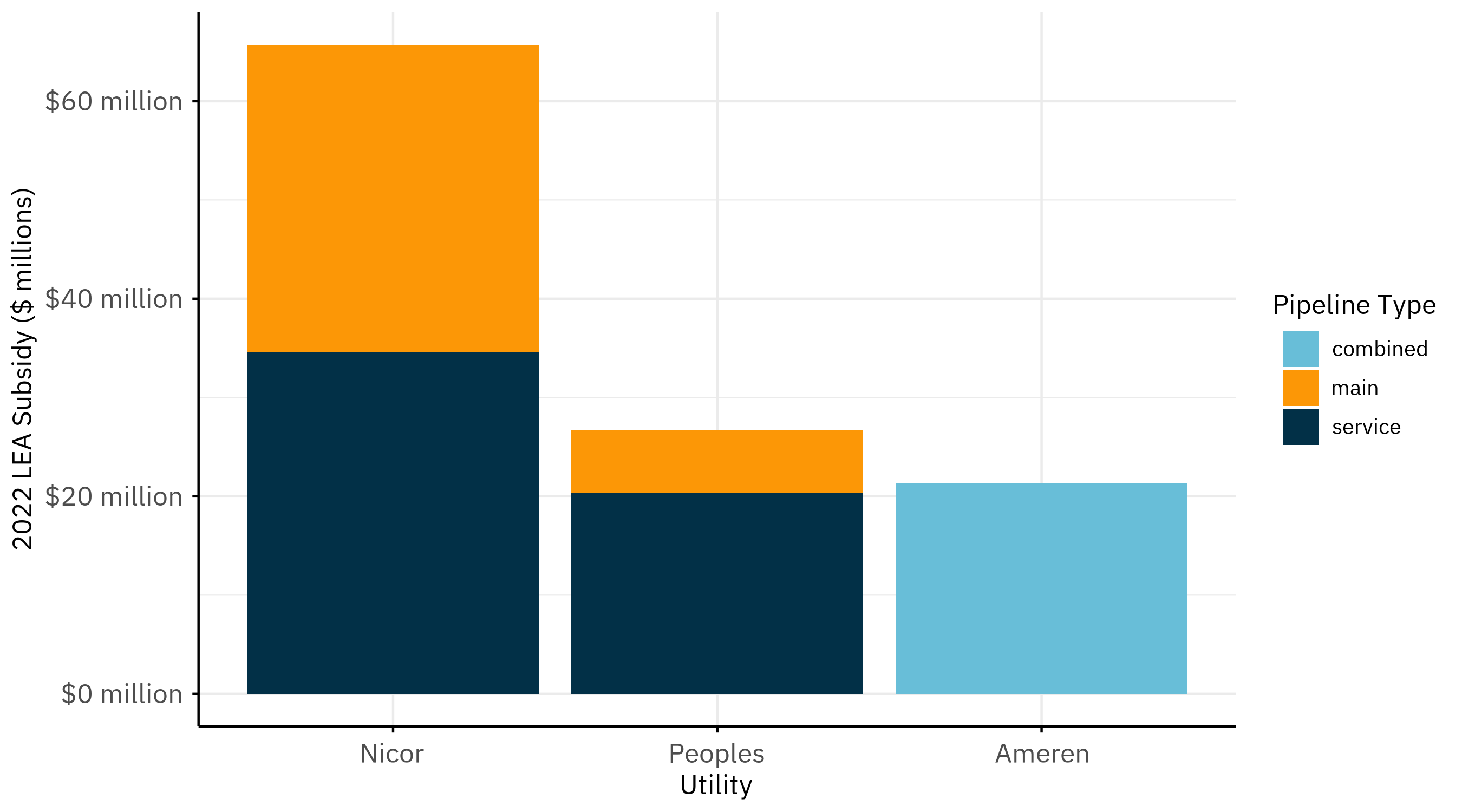 Nicor Gas accounts for more than half of total statewide LEA spending, with Peoples Gas and Ameren Illinois Gas making up the remainder — a split visible both by utility and by pipeline type (Figure 1).